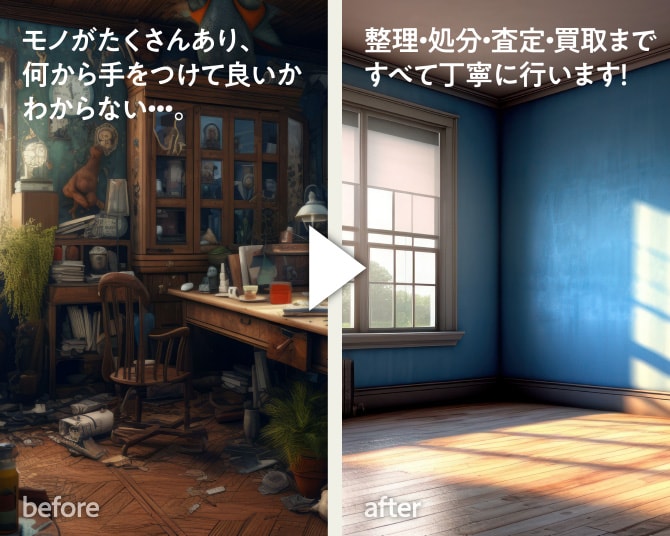 持ち主やご家族がどうしたらいいかわからず放置されている家財や不用品、そして愛用されていたものを一つひとつ丁寧に仕分け・整理し、できるだけゴミを増やさないように査定させていただきます。